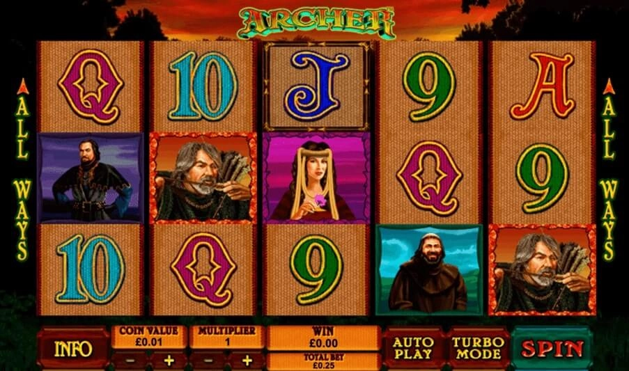 Feel like Robin Hood in the wonderful game Archer slot big win for fun or for real money from Playtech. Its main theme is medieval Britain, as we can see from the characteristically designed symbols. They are located on 5 reels with 243 pay lines. Despite its venerable age, this entertainment has such functions as bonus rounds, multipliers, and the possibility of a mathematical game. Players are allowed to try their luck with bets ranging from $0.25 to $125. With average volatility and 94.99% RTP, the opportunity to get a big win will not keep you waiting. To try Archer slot game free play online you do not need to download separate applications, because you can try the slot completely for free in our game review and get a jackpot in 1500x. As for other tricks, you can be guaranteed to get 7 free spins for 3 scatter symbols on the screen.
